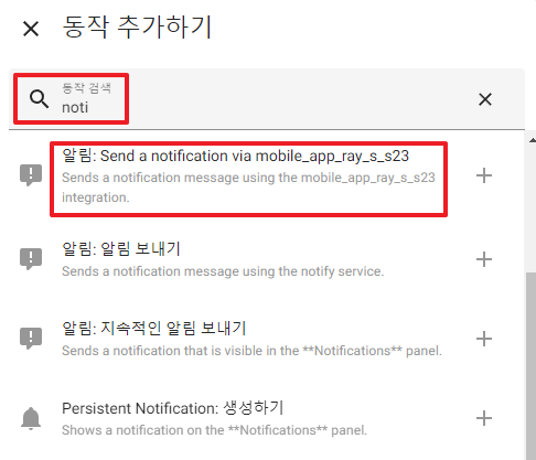 다시 동작 추가하신 다음, noti 를 검색하면 모바일앱용 노티 서비스가 보일 겁니다.