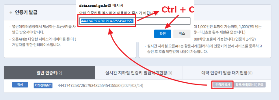 그러면 인증 키가 나오는데, 인증키 복사 항목을 누르시고 컨트롤+C를 눌러 클립보드에 복사해 주세요.